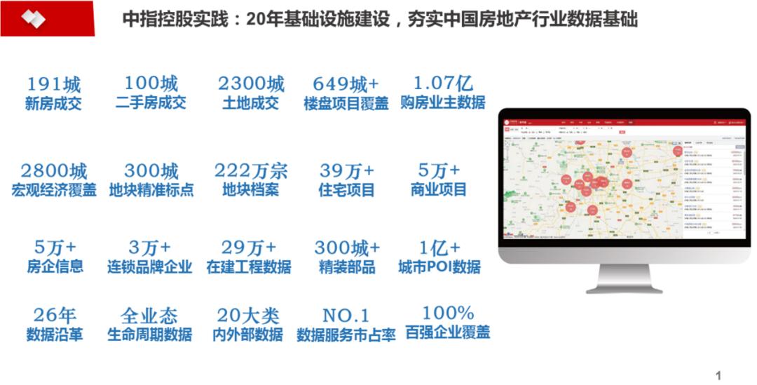 据报道,截至2018年12月31日,在中国房地产开发商百强中,超90%的房地产开发商都是中指控股客户,并且客户续签率超过90%。中指控股拥有积累二十多年的房地产数据,包括2300城土地、630城楼盘、186城新房交易、90城二手房交易、企业和宏观数据等,其数据和指数一直被官方引用。