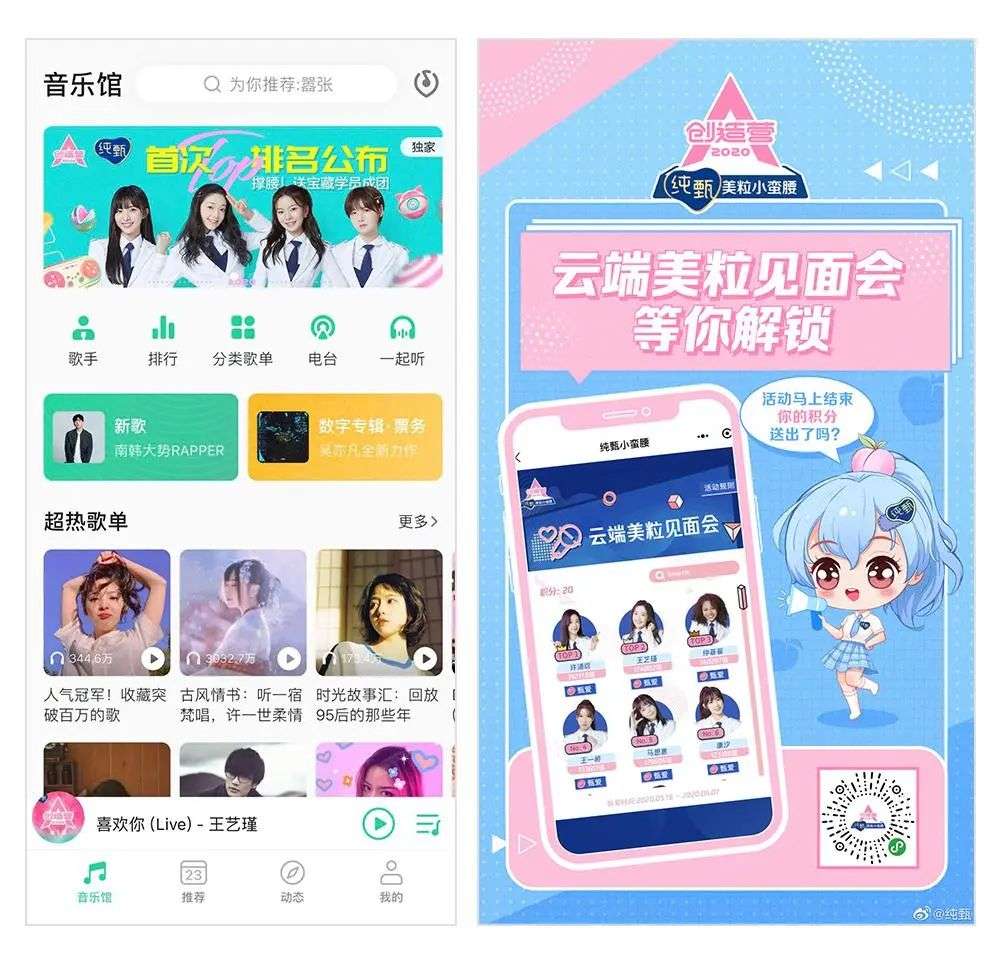 如果从平台方的视角出发,可以发现一个有意思的现象:流量决定营销效果的下限,而内容生态的质量决定着营销效果的上限,因为优质内容会让流量释放出更多价值。举例来说,蒙牛的“纯甄小蛮腰”能够广为人知,与“创造营”系列IP展开的持续合作功不可没。在过去几乎每季的《创造营》中,人们都能看到“纯甄小蛮腰”的身影。作为“首席撑腰官”的它,每一瓶都意味着多个额外投票机会。在商品巧妙植入内容后,它成为了粉丝为心仪的练习生们“应援”的工具,内容对用户的感召力最终刺激了产品的销售。