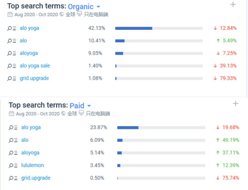 不过,不论是自然流量还是付费流量,使用最多的搜索关键词都是“alo yoga”,还是可以证明客户对 alo yoga 在瑜伽服饰品牌中的认可度。