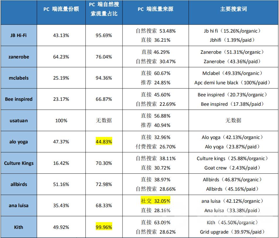 而具体去看 PC 端的流量,除去一个独立站没有数据,剩余各个网站 PC 端自然流量占比都很高。在这之中,alo yoga 和 Kith 的数据是两极,alo yoga 是 10 个网站中唯一一个自然流量占比小于付费流量的,Kith 的自然流量占比却几乎达到 100%。另外,在 Top10 中,ana luisa 的流量结构和其他品牌有很大的差别,笔者会主要解析下 3 个品牌的营销策略。