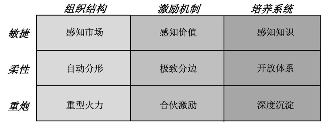 其一,组织结构的设计。首先是“敏捷”,应该让组织有若干的小前端,以便充分感知市场、交互用户。其次是“柔性”,应该让组织能够自动分形聚散,这意味着要有项目制、小微生态圈等形式的柔性组织。最后是“重炮”,同时在组织模块上应该通过坚定不移的业务中台建设,储备重型火力。