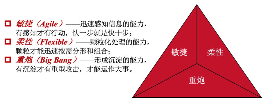 第三是重炮(Big Bang)。即形成沉淀的能力。这是很多企业都会存在的误区,大多企业认为建设平台型组织,应该是以“轻”为主,强调小团队作战。但我们应该知道,如果仅仅为前线配置小米加步枪,只可能小打小闹,是不可能打大仗,也不可能歼灭基地组织的。真正的平台型组织,一定有中后台的深厚沉淀,如研发在中后台的沉淀,让企业拥有在技术上的高地优势。
