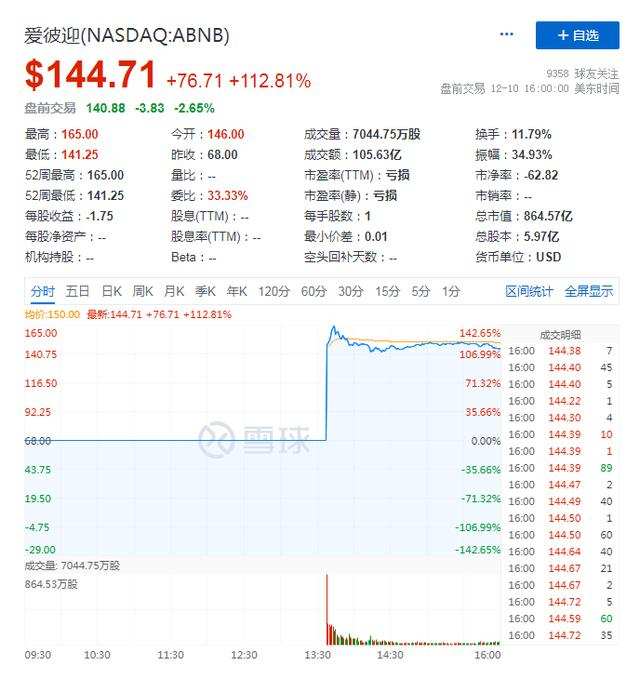 美东时间12月10日,全球民宿短租巨头Airbnb强势登陆纳斯达克,发行股价为68美元。截至下午四点收盘,Airbnb股价大涨112.81%至每股144.71美元,总市值达865亿美元,一举超过旅游巨头Booking的862亿美元的市值。