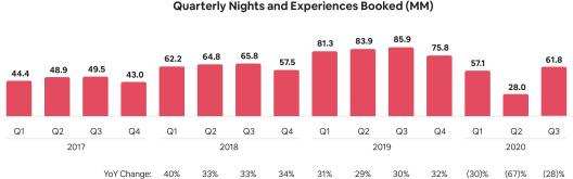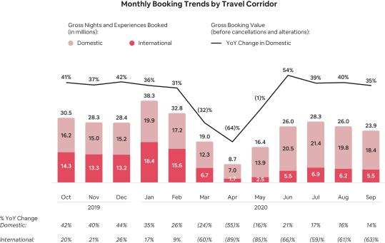 第三季度的回温得益于放宽防疫封锁政策后,在国内和短途旅行中以及长期住宿的弹性需求变多。从以往的营收来源来看,Airbnb的业务一直偏重于跨境旅行,其2019跨境旅行占过夜总付费旅行收入的49%,而疫情助推了短途旅行的增长。