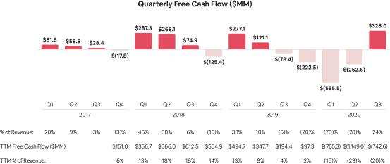 除此之外,Airbnb截至2020年9月30日的9个月,自由现金流为-520.1百万美元,而去年同期的自由现金流为3.198亿美元。疫情减少了预订的住宿天数和经验,减少了GBV,但被成本降低所抵消。