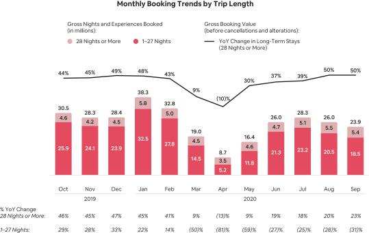 长期住宿是Airbnb在2019年增长最快的类别之一,并且在2020年受疫情影响较小。虽然4月份的1到27晚(短期住宿)类别同比下降81%,但长期住宿仅同比下降13%,并且从2020年5月到2020年9月同比增长。这得益于疫情期间远程办公的人们的需求增长。