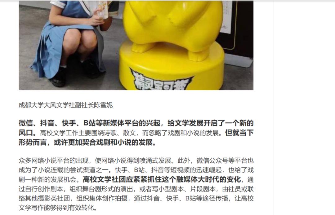 我后来用“文学社+作家”为关键词搜索,还找到了这样一个观点,它来自于一个集结了官方组织的60多个文学社社长研讨会网页——抛开“文学是否真能采用短视频式的创作手法”等讨论,这个颇受争议的采访似乎也在直白地说明: