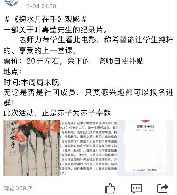 十月的时候,李老师还将投入的范围进一步扩大。当时中国古典诗词大师叶嘉莹纪录片《掬水月在手》上线,T大文学社发出了组织观影的宣传,地点在离学校一两公里外的大众院线影城,原价三十多的票价同学们只需要付20即可,李老师负责补上差价。
