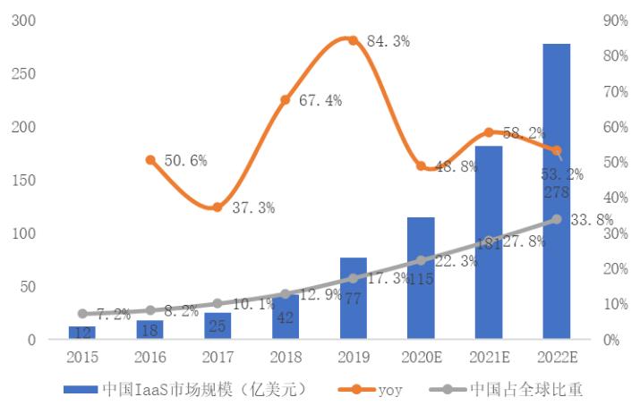 2019年中国公有云IaaS服务市场规模达到77亿美元,相较于2018年的42亿美元增长了84.3%,2019年中国IaaS市场规模占全球市场比重约17.3%。预计到2022年,中国公有云IaaS服务市场规模可达278亿美元,占全球市场比重约33.8%,2019-2022年复合增长率53%,仍处于高速发展阶段。