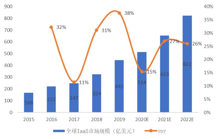 根据Gartner的数据统计,2019年全球公有云IaaS服务市场规模达到445亿美元,相较于2018年的324亿美元增长了38%。预计到2022年,全球公有云IaaS服务市场规模可达822亿美元,2019-2022年复合增长率23%。