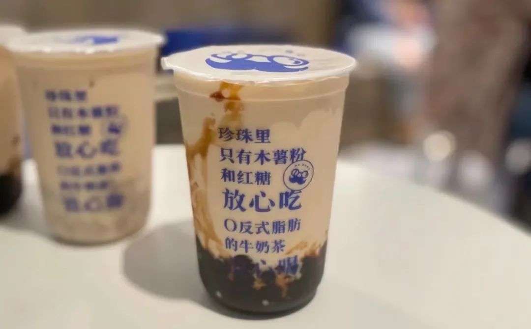 比如这个品牌,在杯身上写着:“珍珠里只有木薯粉和红糖,放心吃,0反式脂肪牛奶茶,放心喝”——
