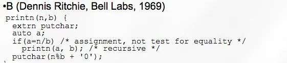 汤普森最终证明,在 PDP-7上使用的语言,是「具有大量 SMALGOL 语法的 BCPL 语义」 ,意思是它看起来像 SMALGOL,但工作起来也像 BCPL。而且,
