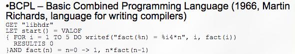 可以说,BCPL 是一种「引导」语言,因为它的编译器具有自编译能力。实际上,BCPL 编译器的一小部分是用汇编或机器代码编写的,而编译器的其余部分是用 BCPL 的相应子集编写的。