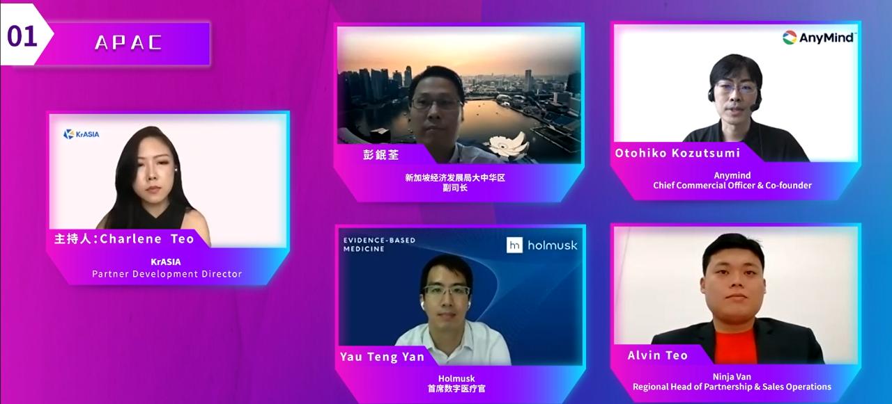 新加坡经济发展局大中华区副司长彭鈱荃,Holmusk 首席数字医疗官 Yau Teng Yan, Anymind Chief Commercial Officer & Co-founder Otohiko Kozutsumi,Ninja Van Regional Head of Partnership & Sales Operation Alvin Teo 针对亚太地区的机遇和前景分享了各自的看法。