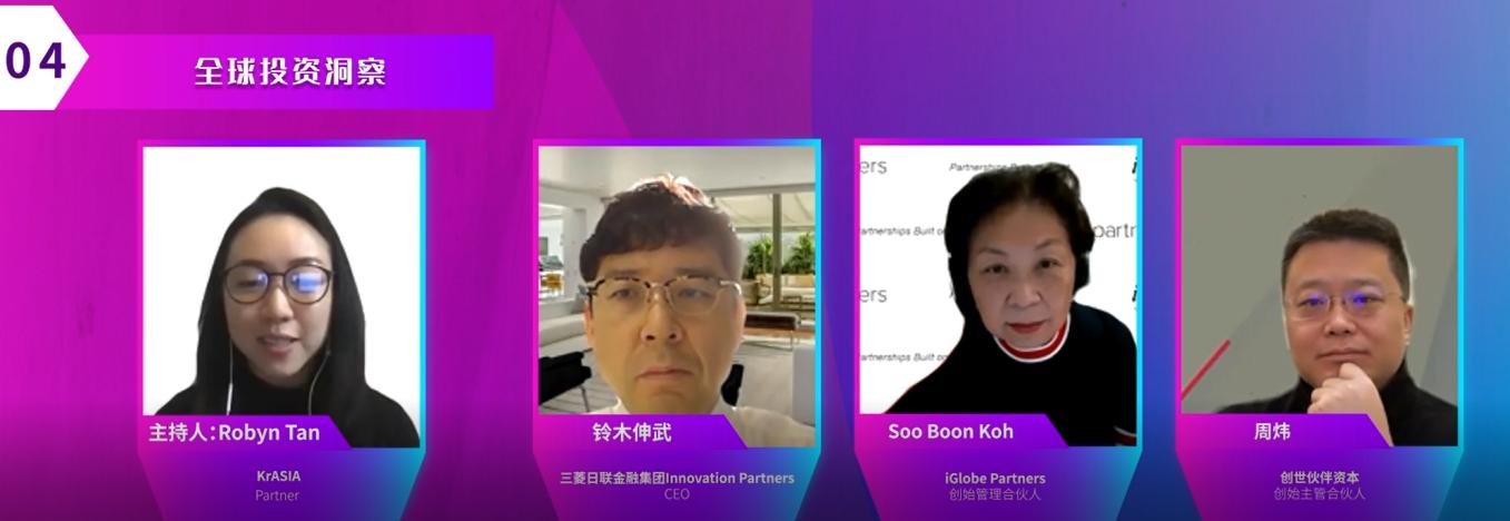 三菱日联金融集团 Innovation Partners CEO 铃木伸武,iGlobe 创始管理合伙人 Soo Boon Koh 以及创世伙伴资本创始主管合伙人周炜在本环节分享了他们对疫情下的国际环境以及一级市场投资环境的理解。