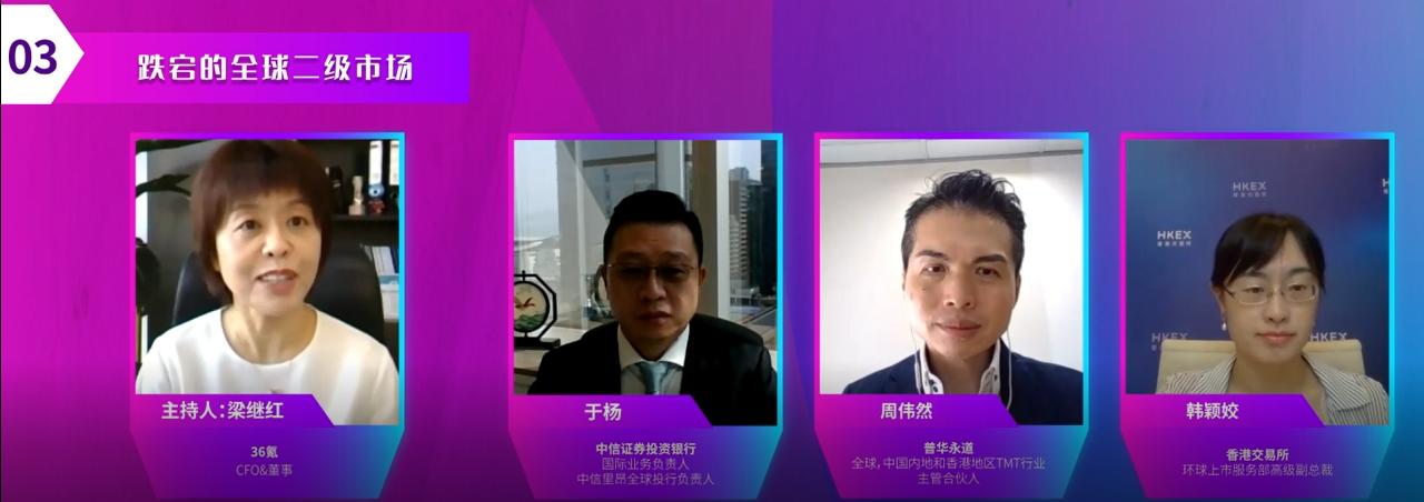 香港交易所环球上市服务部高级副总裁韩颖姣,中信证券投资银行国际业务负责人、中信里昂全球投行负责人于杨,普华永道全球、中国内地和香港地区 TMT 行业主管合伙人周伟然在这一环节分享了他们对美股市场、港股市场和中概股前景等问题的看法,36氪 CFO & 董事梁继红主持这一环节。