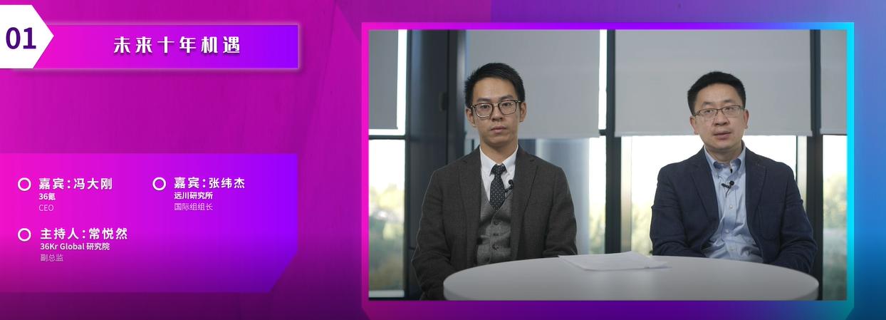 36氪 CEO 冯大刚和远川研究所国际组组长张纬杰在这一环节讨论了过去十年间中国和世界面对的机遇与挑战以及他们对于未来趋势的预判。