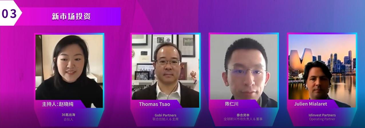 Gobi Partners 联合创始人 & 主席 Thomas Tsao,泰合资本全球新兴市场负责人 & 董事陈仁川,Idivest Partners Operating Partner Julien Mialaret 在本环节发表了他们对新兴市场机遇和投资的洞见。