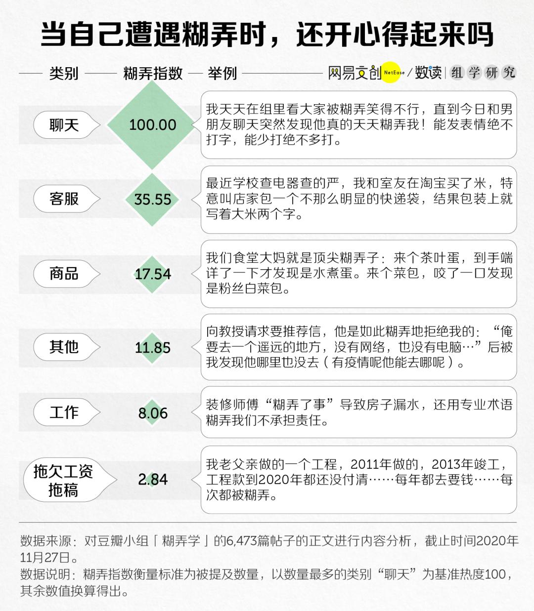 弄弄子们(小组成员昵称)发掘总结了各种糊弄学技巧,如:不管对方笑话好不好笑,都要回“哈哈哈哈哈哈哈哈”“xswl”;不用仔细听对方倒的苦水,只要用“感叹词+评价事情+感受”的万能句型回答;双十二老有人让你“砍价助力”,准备一张“已停止访问该网页”的手机截图。