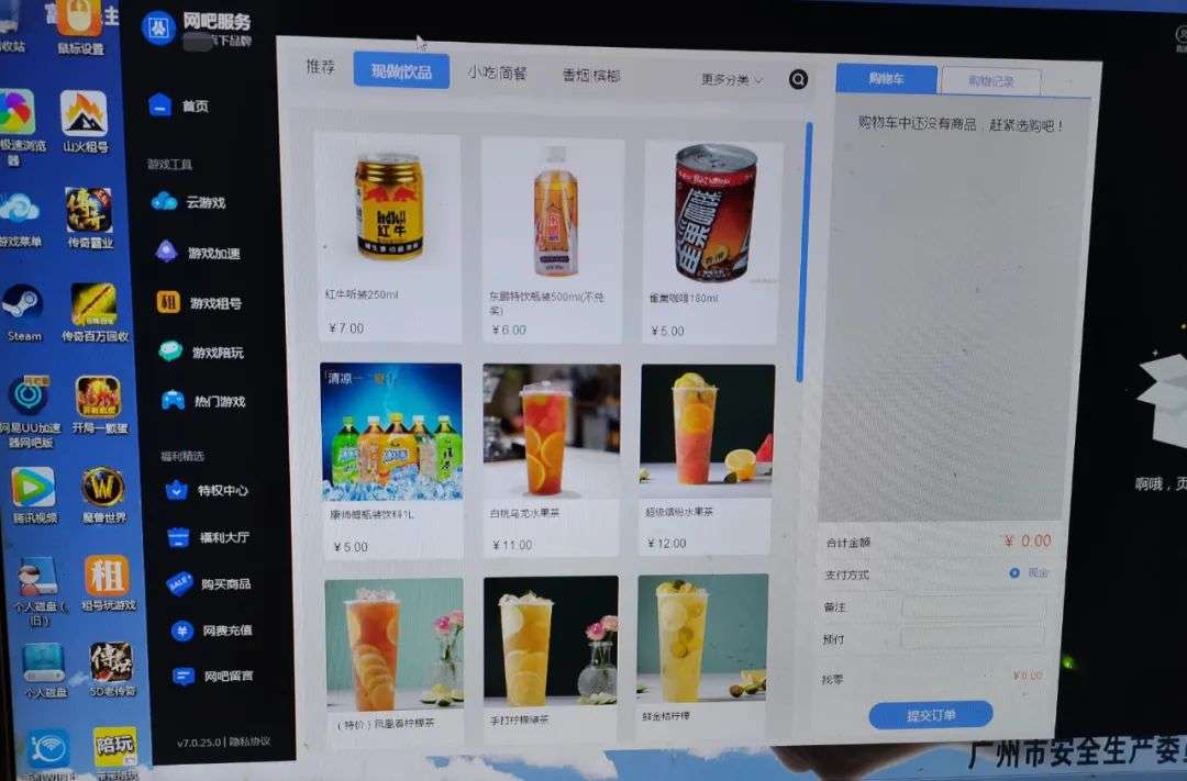 网吧里播着《永不失联的爱》和《笑纳》等流行歌,不时穿插着 “卧槽”、“漂亮”、“看你的”,大家都玩嗨了,我用电脑下单了一瓶饮料,店员一会就送过来,价格跟便利店差不多。