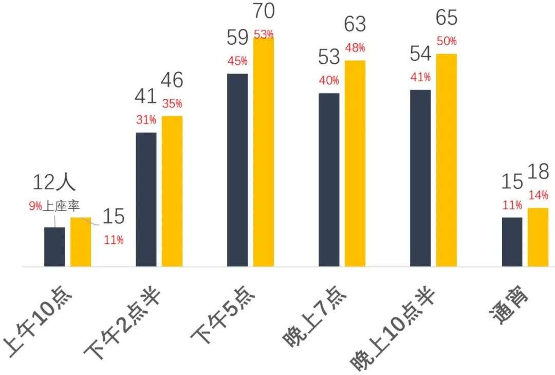 下午2点半,41人,上座率31%,下午4点左右,41人,上座率31%,晚上10点半 65人,上座率49.6%,周六早上10点,15人,上座率11.4%,下午2点半46人,上座率35%,周末客流大概是工作日1.2倍 左右。