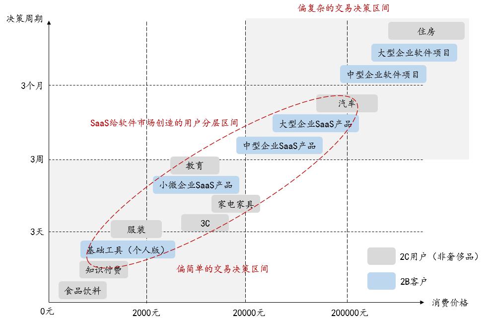 这里有个惯性的认知误区,以往总有人说2B市场不同于2C,存在决策者和使用者分离、决策流程繁杂的问题。按照分层逻辑看,发现造成这种误解主要原因还是在于价格区间。