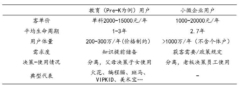 以Pre-K领域用户为例,单科消费价基本在2000-15000元/年,用户生命周期大概1-3年,价格限定其最终可触达的用户体量大约为200-300万/年,产品解决的是子女知识提前储备的弱刚性需求;反观小微企业用户,客单价在1000-20000元/年,用户的生命周期大概2.7年,体量大约在1000万/年,某些产品为其解决的是获客管理、销售培训、财税申报等刚性需求。