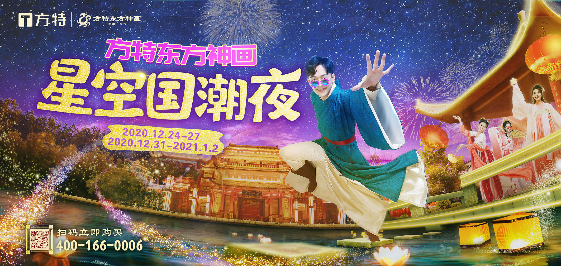 12月24日-12月27日、12月31日-1月2日,长沙方特东方神画再度迎来夜场,营业时间为17:00—21:00,12月31日跨年夜营业时间将延长至24:00。