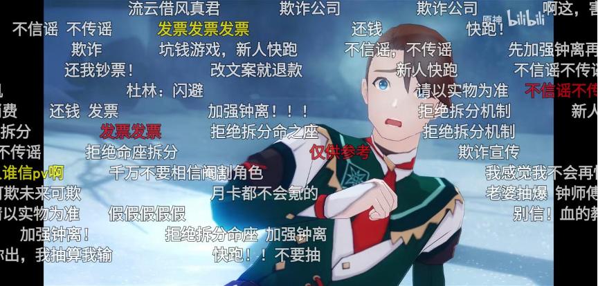 但漫长的等待本就高度消耗情感,一旦最终结果令玩家失望,玩家长期压抑的情感就会瞬间转化为怒火向官方烧去,钟离事件便是最好的例证:攻陷弹幕、号召停氪、集体开发票,玩家总有办法给官方造成实际冲击——毕竟玩家真正喜欢和忠诚的对象是游戏角色而不是游戏公司,玩家会为了心爱角色苦苦等待、一掷千金,也会在角色被官方“背刺”时冲冠一怒为红颜。