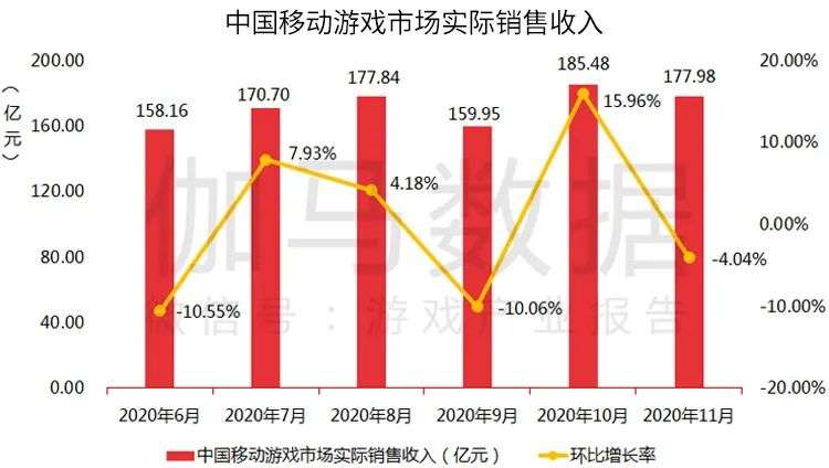 伽马数据《2020年11月移动游戏报告》(公众号:游戏产业报告)显示:2020年11月,中国移动游戏市场实际销售收入177.98亿元,环比下降4.04%。