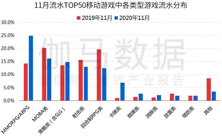 2020年11月,移动游戏流水TOP50产品中,MMORPG/ARPG流水份额较去年同期有较大提升,为细分品类的第一大品类,这主要受益于《原神》和《天涯明月刀》带来的流水增量;卡牌类份额也有较大提升,本月上线新品《少年三国志:零》《 街霸:对决 》继续为卡牌类带来增量。