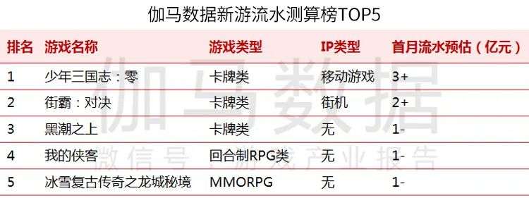 新游流水测算榜TOP5中,有3款为卡牌类游戏,卡牌类依旧展现出较高的市场活力,其中游族网络“少年三国志”系列全新力作《少年三国志:零》表现较为突出。《少年三国志:零》在玩法上做出创新,是一款融合竞技与策略为一体的即时战斗卡牌游戏,同时还融入放置玩法,军队的加入让搭配更加多元化,预测首月流水超3亿元。