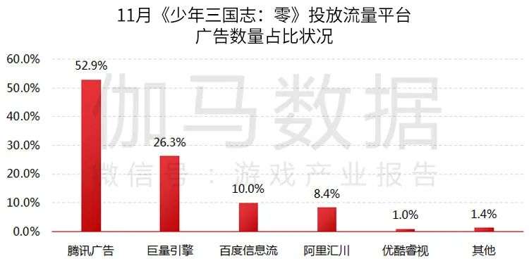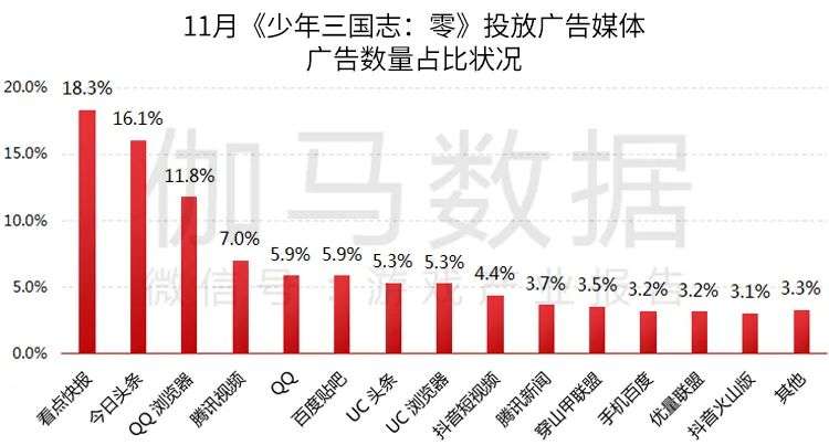 《少年三国志:零》上线首月在12家流量平台进行了广告投放,广告媒体达到28家。在该款游戏的广告投放分布上,腾讯广告平台数量占比为52.9%,巨量引擎平台占比为26.3%。广告媒体平台分布上,看点快报占比最高,为18.3%,今日头条占比为16.1%,QQ浏览器、腾讯视频和QQ合计占比近25%。新品上线初期,广告媒体投放会给产品带来更多的曝光度,进而为产品带来更多的用户。