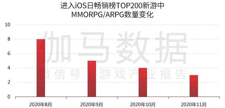 2020年11月,进入过iOS日畅销榜TOP200的新游数量为13款,10月、11月新游数量明显萎缩。这一定程度受到爆款新游《原神》和《天涯明月刀》在这一时期上线的影响,爆款新品会吸引大量用户流量,其他上线产品的流量获取将会受到较大影响。可见MMORPG/ARPG品类在近两个月上线的新品数量锐减。