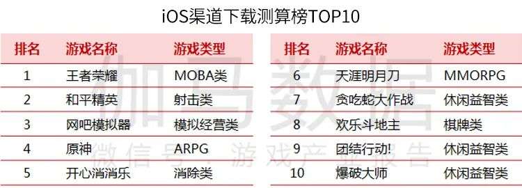 iOS渠道下载测算榜TOP10《王者荣耀》登顶