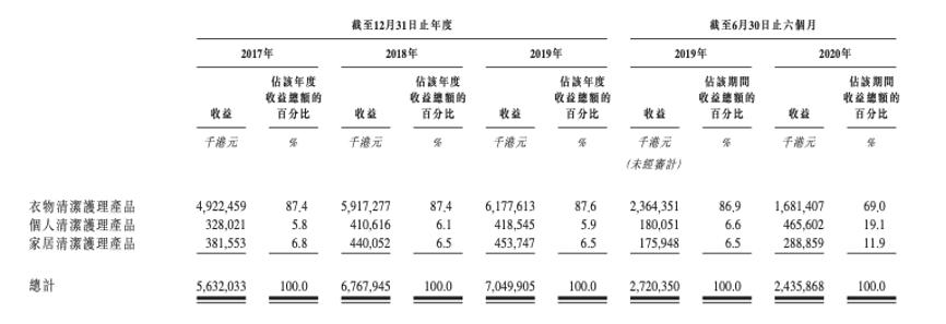 线上线下双联动,为蓝月亮带来了不错的营收。据招股书数据显示,2017-2019年,蓝月亮分别实现营收56.32亿港元、67.68亿港元、70.5亿港元,复合年增长率为11.9%。这一增速已近乎于同期行业平均增长的3倍。