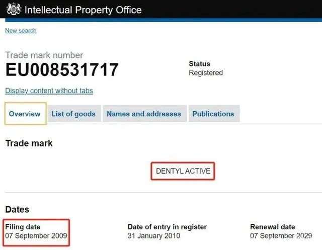 对于商标,英国知识产权局官网显示,“DENTYL ACTIVE”商标早在2009年12月就被提交申请,2010年1月注册,商标所有人是VentureLife Group Plc。