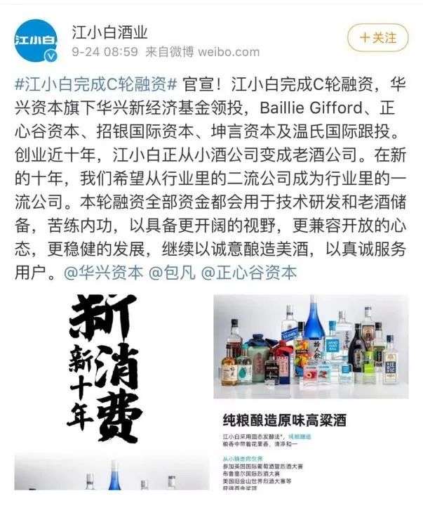 江小白并非没有意识到自己的危机。今年9月24日,江小白正式宣布完成C轮融资,其表示融资将全部用于技术研发及老酒储备。江小白要做高端口粮液酒,并打造属于自己的全产业链。