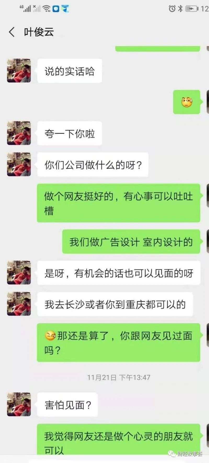 双方越聊越投机,索性加了微信,关系愈发火热,从生活中的寻常琐事,到深埋心扉的情感秘密,经常聊到深夜,她逐渐默认对方为自己的真命天子,并对他言听计从。