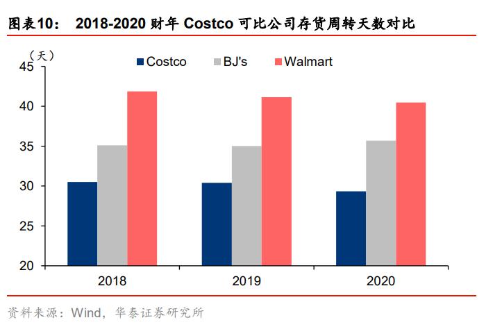 同时,较低的毛利以及大规模的包装能够帮助Costco实现存货的高周转,2018-2020财年Costco的存货周转天数为30天,显著低于BJ’s和沃尔玛。
