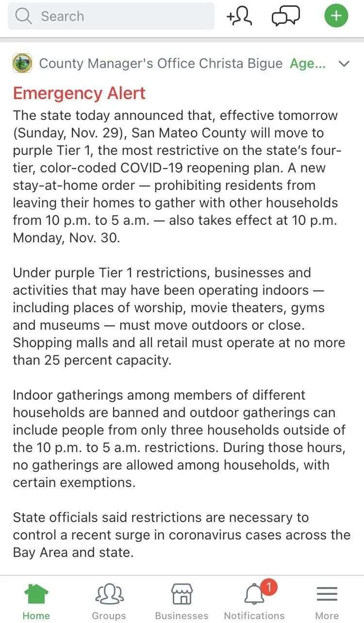 以加州圣马特奥县公共健康卫生部门为例,圣马特奥县升级辖区范围内的健康安全级别到“最紧急”状态(tier 1),该条信息就会自动出现在App的置顶位置。