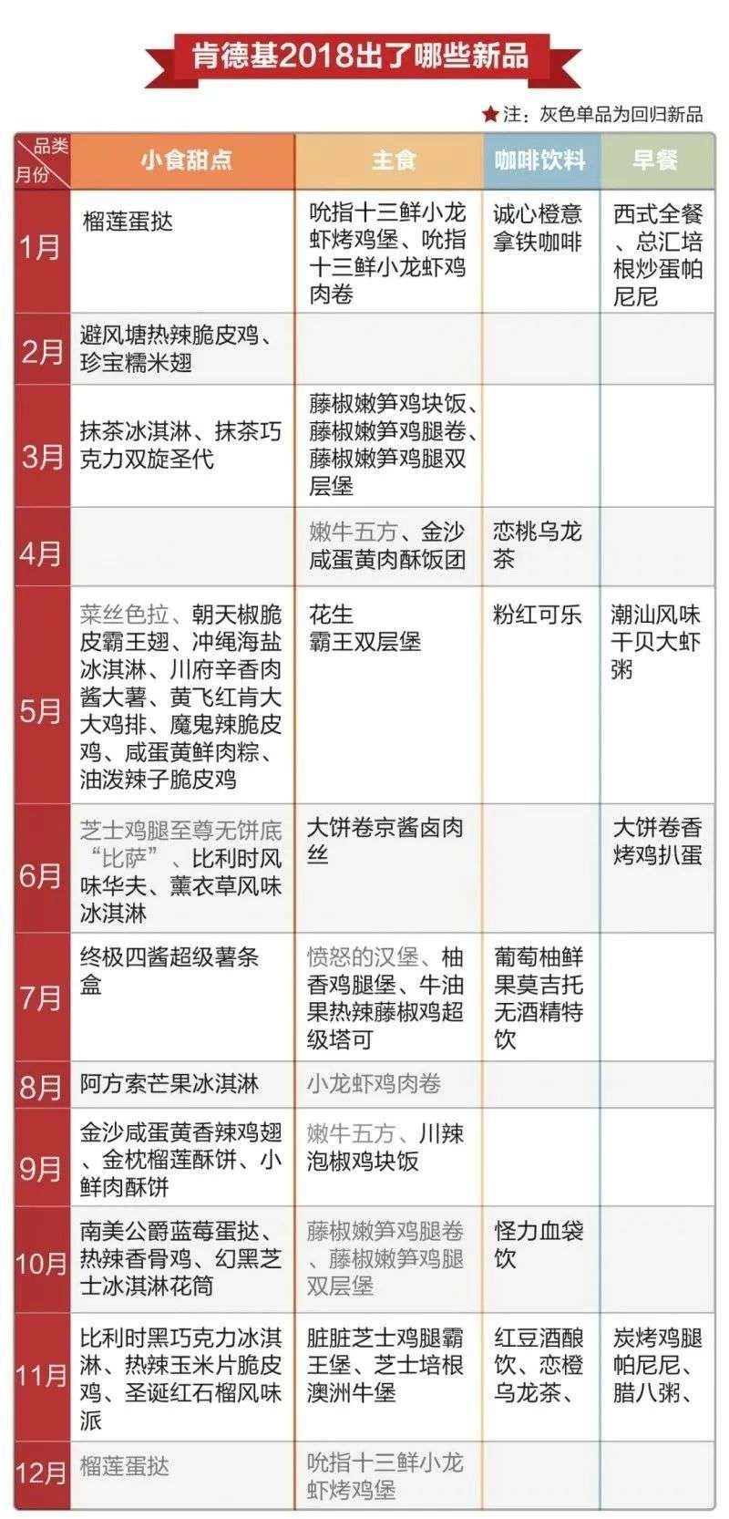 首先肯德基研发新品的频率离奇地快。据不完全统计,仅2018年肯德基就推出了20款主食、28款小吃、7种饮料。