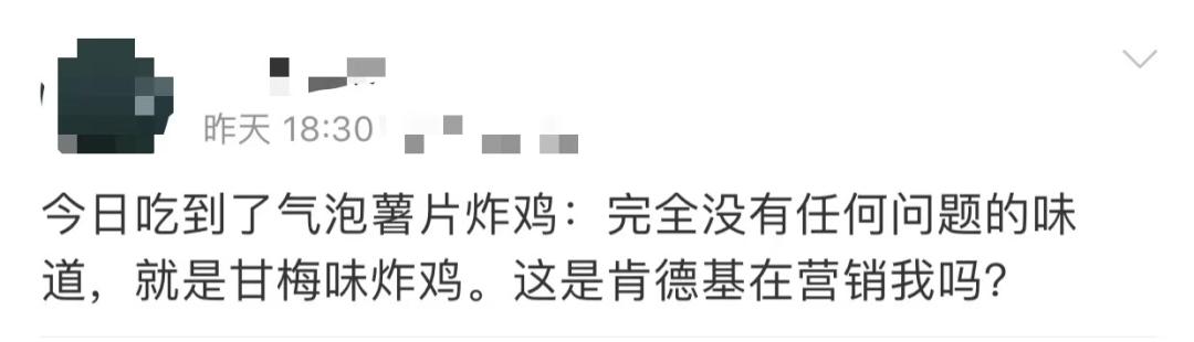 本周经历2020年最大遗憾。我刚想下单肯德基最新黑暗料理“气泡薯片炸鸡”,就得知它前一天下架的噩耗。