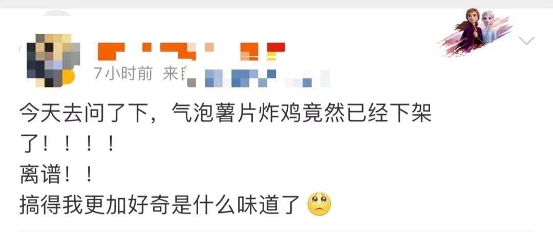 气泡薯片炸鸡被紧急下架也好,1450万份售罄也罢,现在仍然有大批和我一样因为没抢到在捶胸顿足,办公室的妹子听完手里的外卖也不香了“完蛋,现在更想吃了。”