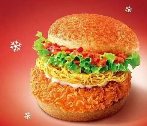 或者像5年前圣诞推出的红辣腿堡,名字听起来平平无奇,但面包夹面条的操作引发网友口吐莲花。