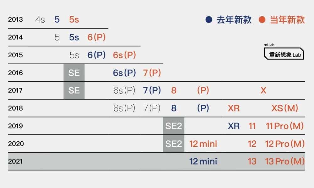 Apple 的更新节奏有一个明显的特征,就是梅花间竹式(Tick-Tock)更新,即一年大更新、一年小更新,这种规律在 iPhone X 出现以后周期拉长为三年,但基本模式不变。将 Plus 看作大屏版本不作为独立机型,每年的 iPhone 发布从原来长期稳定在「每年一新款、前两年退居次新款和入门款」的策略,改为「每年两新款、保留去年次新款、用 SE 入门款长期扫尾」的策略。