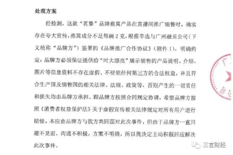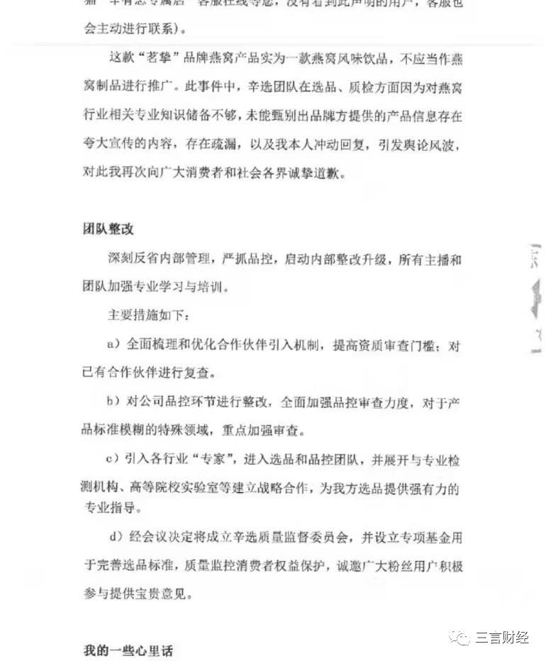 声明提到,品牌方虚假宣传。而辛选团队在选品、质检方面因为对燕窝行业相关专业知识储备不够,未能甄别出品牌方提供的产品信息存在夸大宣传的内容,存在疏漏。还将进行团队整改。