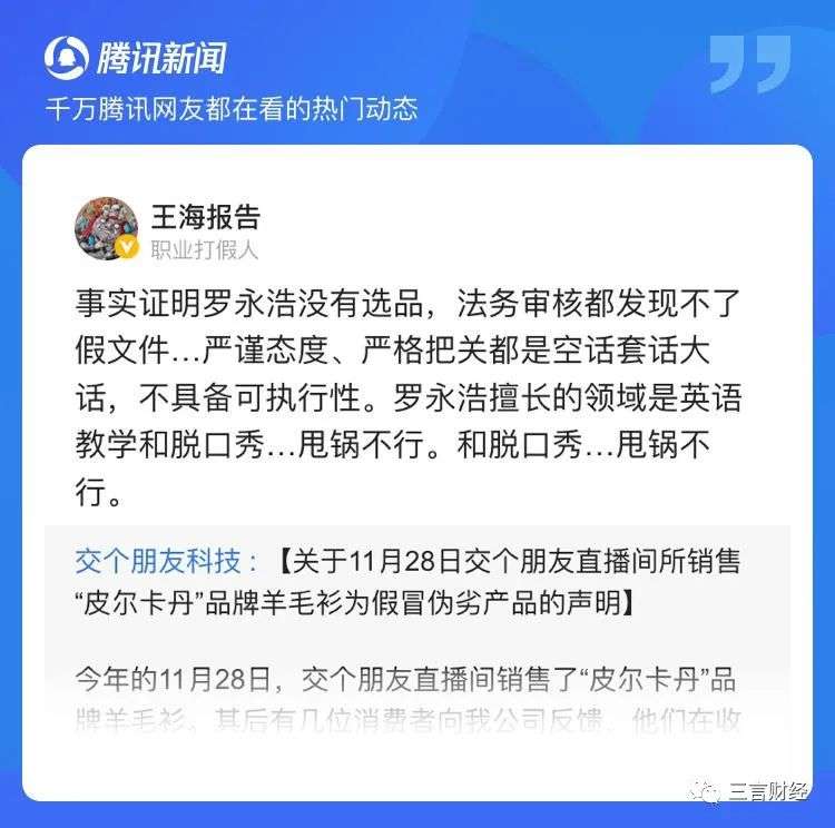 对此,职业打假人王海称,“事实证明罗永浩没有选品”、“甩锅不行”。王海表示,“法务审核都发现不了假文件……严谨态度、严格把关都是空话套话大话,不具备可执行性”。