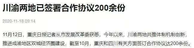 截至11月中旬,川渝两地已签署框架合作协议200余份,涵盖经济社会发展的大部分领域,在成渝两地不断推进一体化发展的背景下,可以预见未来城与两座城市之间各种深入合作会越来越多。