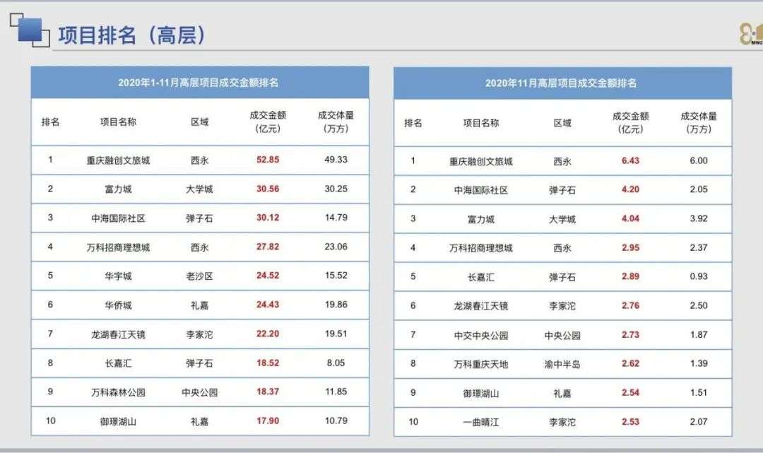 根据铭腾机构的数据统计,今年1~11月,无论是高层还是洋房,西永大学城片区有多个项目比如重庆文旅城,万科招商理想城,学樘府,富力城等,都排在成交榜单的前5位。